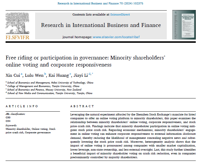 bat365官方网站bat365官方网站崔欣博士(第一作者)撰写发表了有关中小股东积极主义对管理层行为及公司治理影响的文章。文章名为“Free riding or participation in governance: Minority shareholders’ online voting and corporate responsiveness”,刊发于Research in International Business and Finance。该期刊是SSCI一区期刊,ABS2级期刊,影响因子6.5,在JCR学科类别Business & Finance的111种期刊中排名第9。