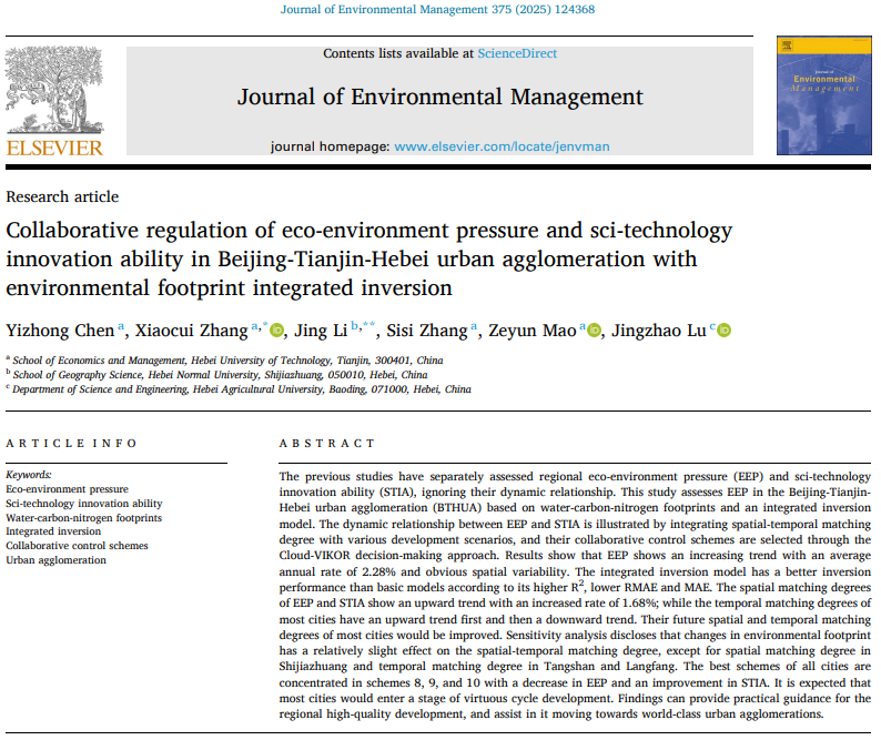 近日,bat365官方网站bat365官方网站陈义忠副教授(第一作者)撰写发表了有关区域生态环境压力与科技创新能力的演变特征及协同调控策略的文章。文章名为“Collaborative regulation of eco-environment pressure and sci-technology innovation ability in Beijing-Tianjin-Hebei urban agglomeration with environmental footprint integrated inversion”,刊发于Journal of Environmental Management。该期刊是环境科学与生态学领域的高水平期刊,TOP期刊、JCR-1区、ABS 3级,学院A1级期刊,影响因子8.0,在Environmental Science学科类别的358本期刊中排名第34。
