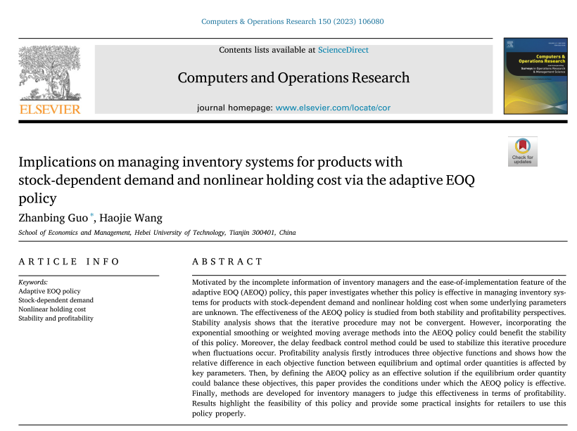 bat365官方网站bat365官方网站郭战兵博士(第一作者和通讯作者)撰写发表了关于库存管理策略的文章。文章名为“Implications on managing inventory systems for products with stock-dependent demand and nonlinear holding cost via the adaptive EOQ policy”,刊发在Computers & Operations Research。该期刊是运筹学与管理科学二区期刊,影响因子4.6。