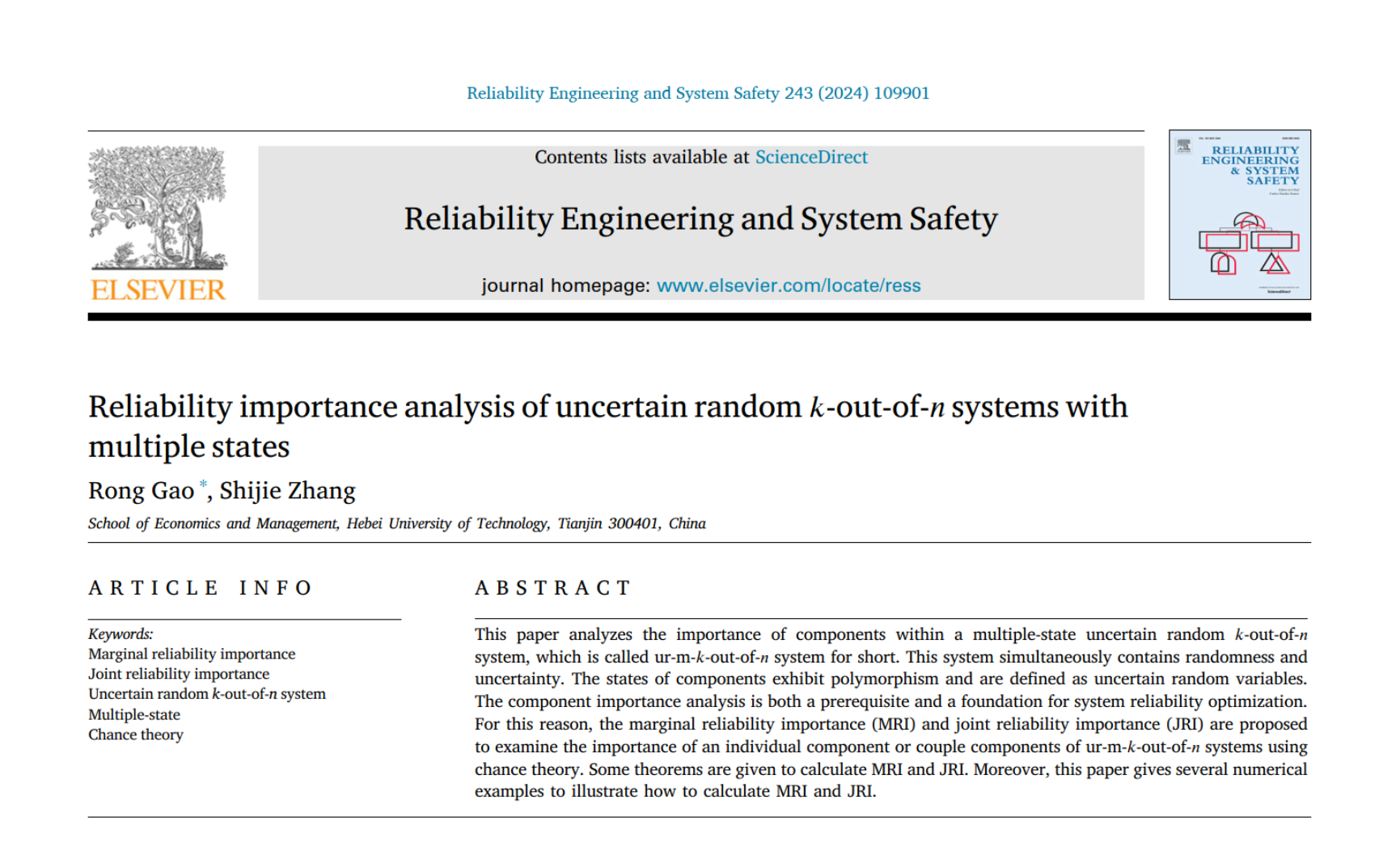 bat365官方网站bat365官方网站高荣副教授(第一作者和通讯作者)撰写发表了有关多状态不确定随机k-out-of-n系统中元件重要度分析的文章。文章名为“Reliability importance analysis of uncertain random k-out-of-n systems with multiple states”,刊发在Reliability Engineering & System Safety。该期刊是SCI, JCR一区期刊,ABS三星,影响因子8.1。