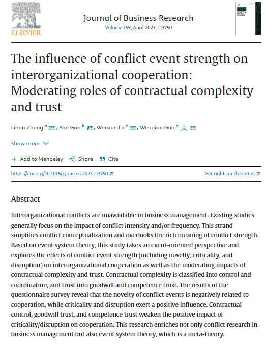 近日,bat365官方网站bat365官方网站张丽晗博士(第一作者)撰写发表了冲突强度对组织间合作影响的文章,该文章扩展了冲突强度内涵,探究了合同复杂性与信任对冲突强度效果的调节作用。文章名为“The influence of conflict event strength on interorganizational cooperation: Moderating roles of contractual complexity and trust”,刊发在Journal of Business Research。该期刊是商业管理领域一流国际期刊,SSCI二区TOP期刊,影响因子11.3。