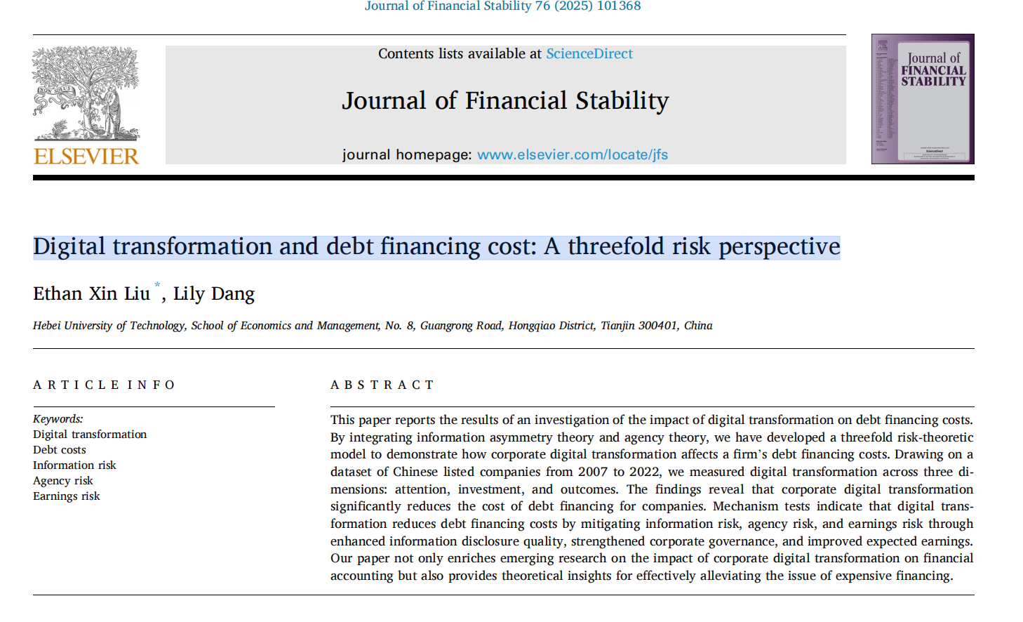 近日,bat365官方网站bat365官方网站刘鑫教授(第一作者、通讯作者)撰写的论文《Digital Transformation and Debt Financing Cost: A Threefold Risk Perspective》在Journal of Financial Stability上发表。该期刊是SSCI一区期刊,ABS3级期刊和FMS-B类期刊,2023年影响因子6.1,具有较高的学术影响力。