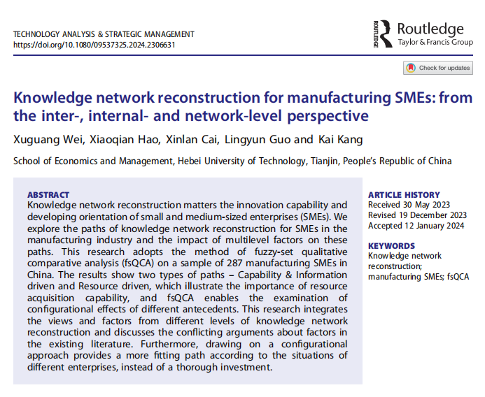 bat365官方网站bat365官方网站魏旭光副教授(第一作者)撰写发表了关于探索中小制造企业知识网络重构路径的文章。文章名为“Knowledge network reconstruction for manufacturing SMEs: from the inter-, internal- and network-level perspective”,刊发在Technology Analysis & Strategic Management。该期刊是SSCI,JCR三区期刊。