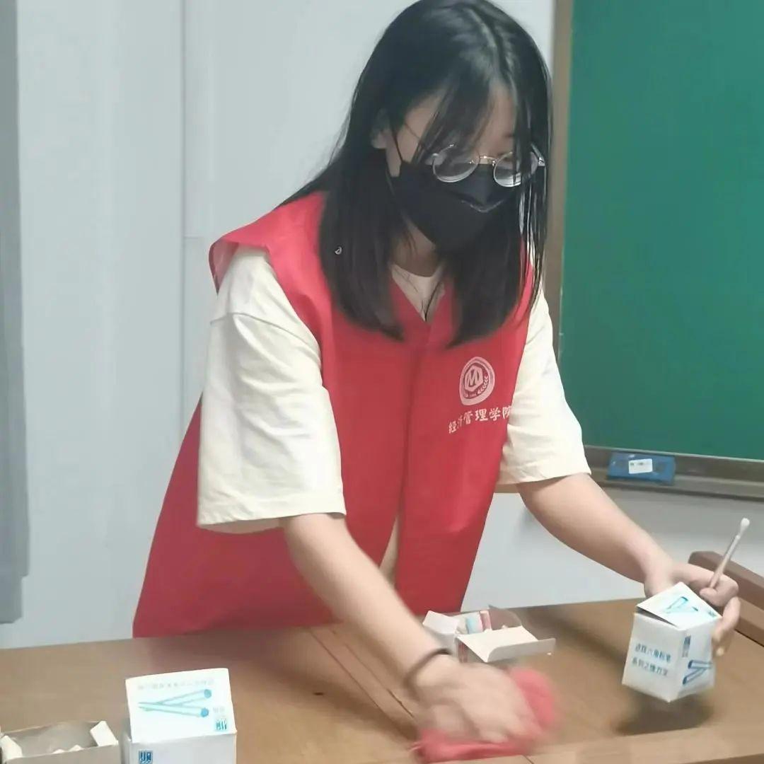 本次共招募11名志愿者于5月24日参与进MBA教学楼内的教室清扫活动。同学们将教室书箱和地面上的垃圾清理收集后倒置于各楼层大垃圾桶内,并同时对落灰的桌子进行擦拭。在活动尾声进行了拖地,顺带将楼层全部垃圾运至楼外垃圾桶旁。一小时过后,偌大的教室焕然一新,为经管学子营造了更好的学习环境。