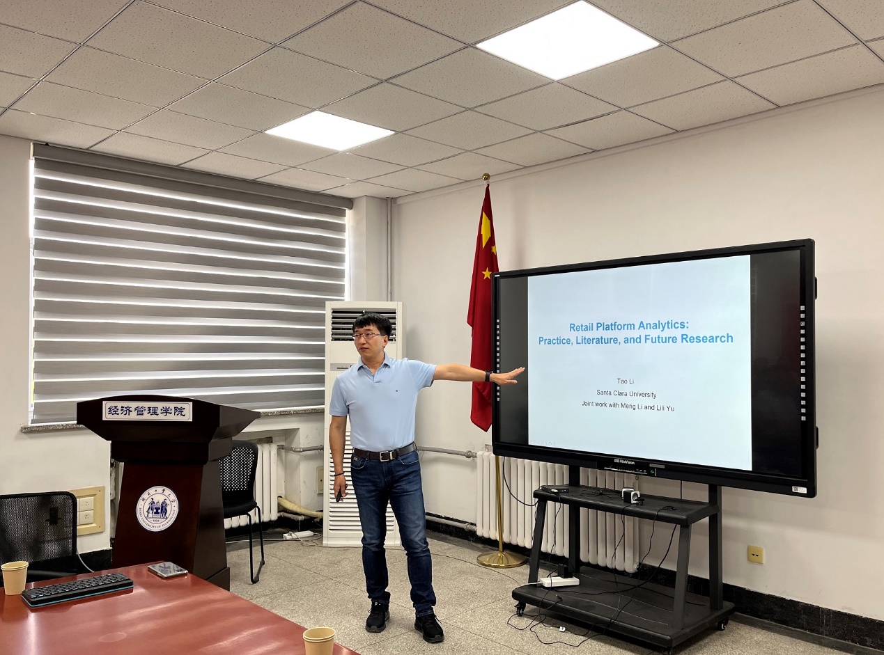 吴晓丹教授首先对李涛教授的来访表示热烈欢迎,并简要介绍了李博士的求学和工作经历。随后,李博士分享其团队在国际顶级期刊POM的在投综述类论文Retail Platform Analytics: Practice, Literature, and Future Research》。讲座主要从实践、文献和未来研究方向三个方面展开。