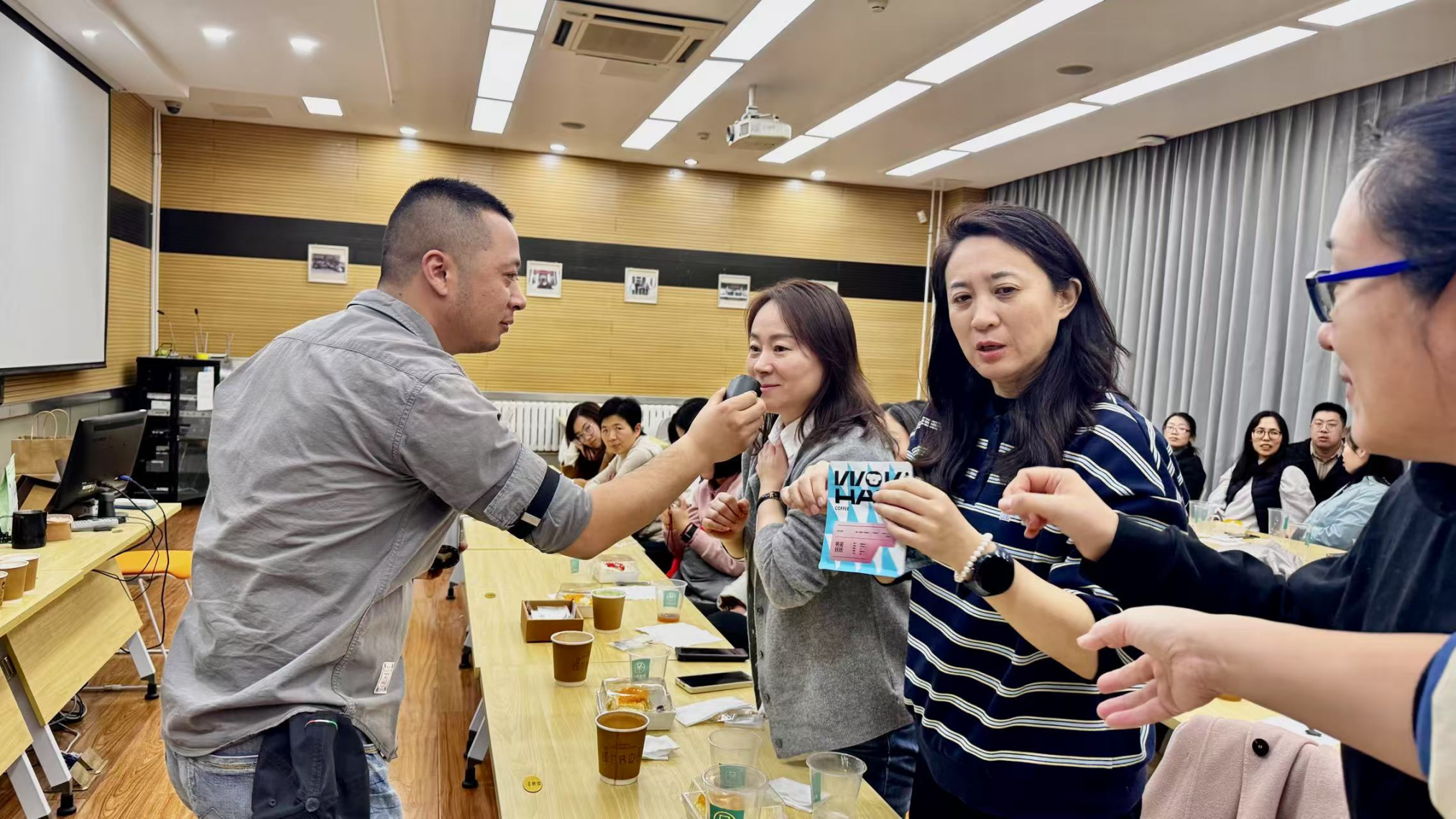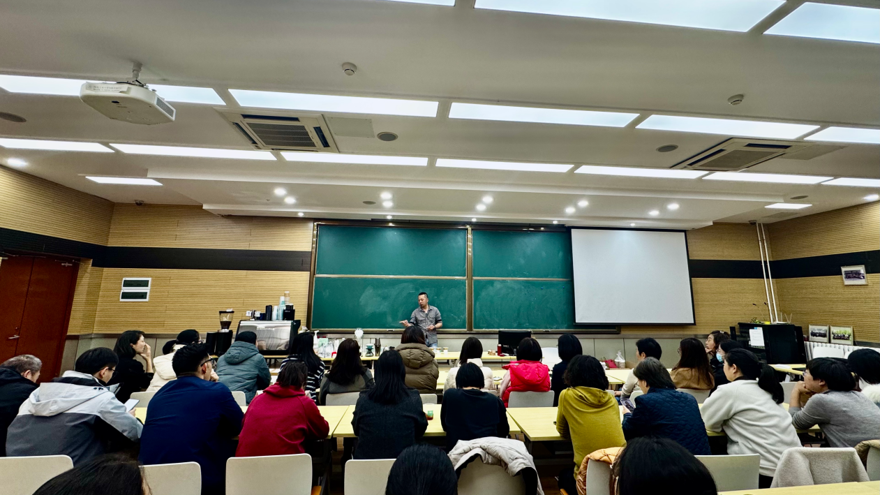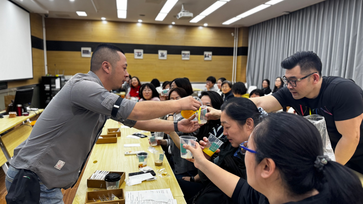 活动伊始,以咖啡的起源为引,咖啡师从起源地埃塞俄比亚的古老传说,到中南美洲的种植庄园;从阿拉比卡的馥郁果香,到罗布斯塔的醇厚浓烈,揭开了咖啡豆的产地、品种与烘焙工艺的奥秘。讲解过程中,咖啡师向在座的教师展示了不同口味的咖啡豆及其特点,在场教职工听得津津有味,不时提出问题,与咖啡师热情互动。