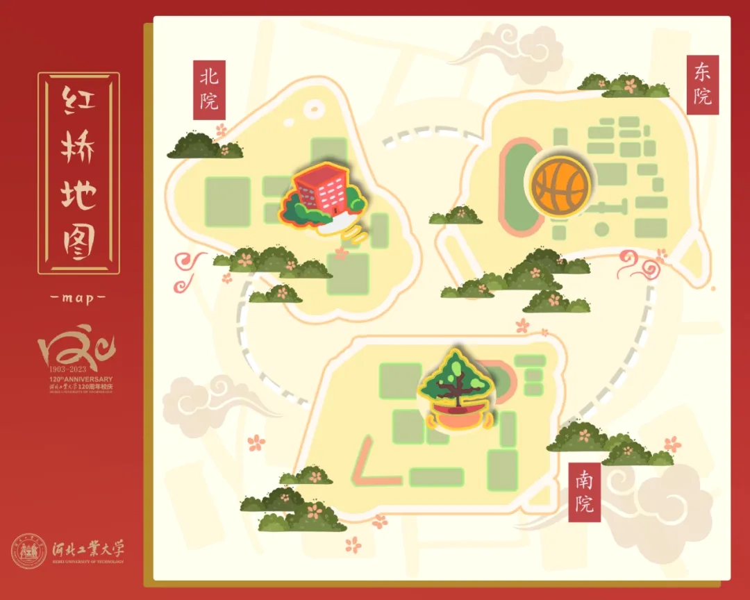 北辰校区共设置七个打卡摊位,红桥校区共设置三个打卡摊位,集章活动共九个印章,包括校徽、校史博物馆、红桥东院、红桥北院、北辰校区、南院礼堂、钟楼、水上图书馆、体育馆(两个校区均可集齐无需跨校区集章)。